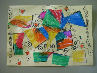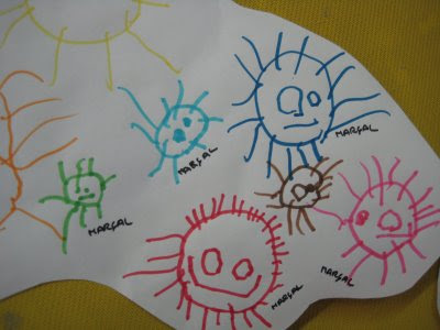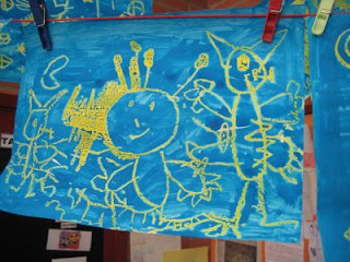Els nens i nenes de la classe de P-4 han fet aquests dibuixos, dibuixant amb ceres de color groc el tema i pintant el fons amb pintura tempera diluida